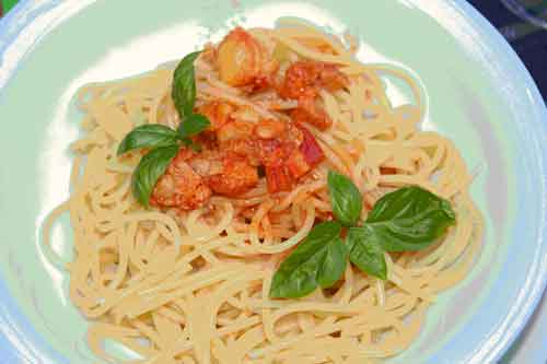 4 Spaghetti al dente kochen und mit der heißen Hommersoße servieren.
